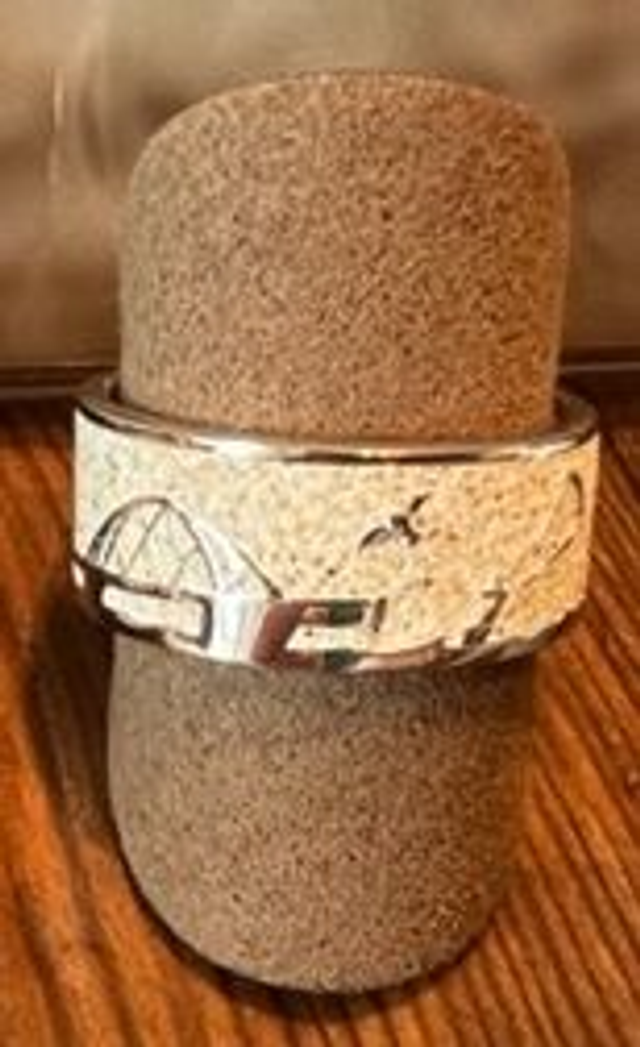 Strandsandring "Großenbrode" mit den silbernen Motiven: Kirche Großenbrode ,Möwe, Fehmarn-Sund-Brücke, Kiter, Turm der Erlebniswelt Großenbrode, eingebettet in Strandsand und gefasst in rhodiniertem 925er Sterling-Silber.
